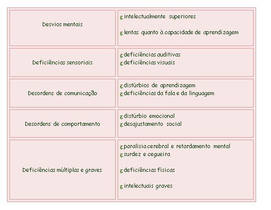 As crianças excepcionais são com frequência agrupadas para facilitar a comunicação entre os profissionais. É comum encontrar-se a seguinte classificação: